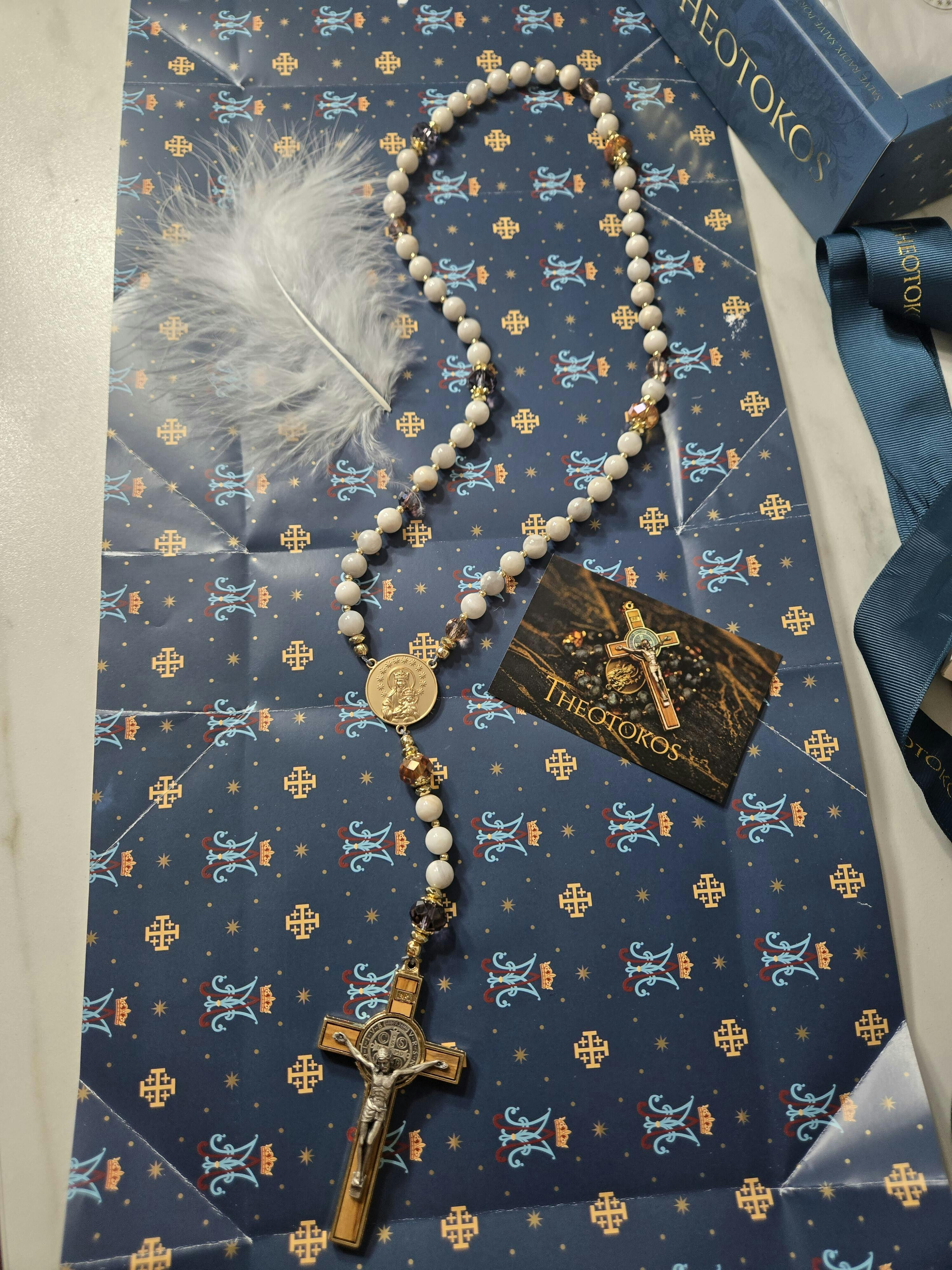 This divine rosary is handcrafted in Lithuania with the finest materials, including a gold-plated cross with olive wood inlays from Italy, a unique Theotokos medal and gold-plated brass accents, and a Advanced Microbraid Cord Technology that is extra strong. The 8mm slight gray crazy lace agatas and crystal glass beads for Hail Mary prayers and the 12mm faceted crystal glass beads for Our Father prayers add to the beauty and meaning of this devotional tool.